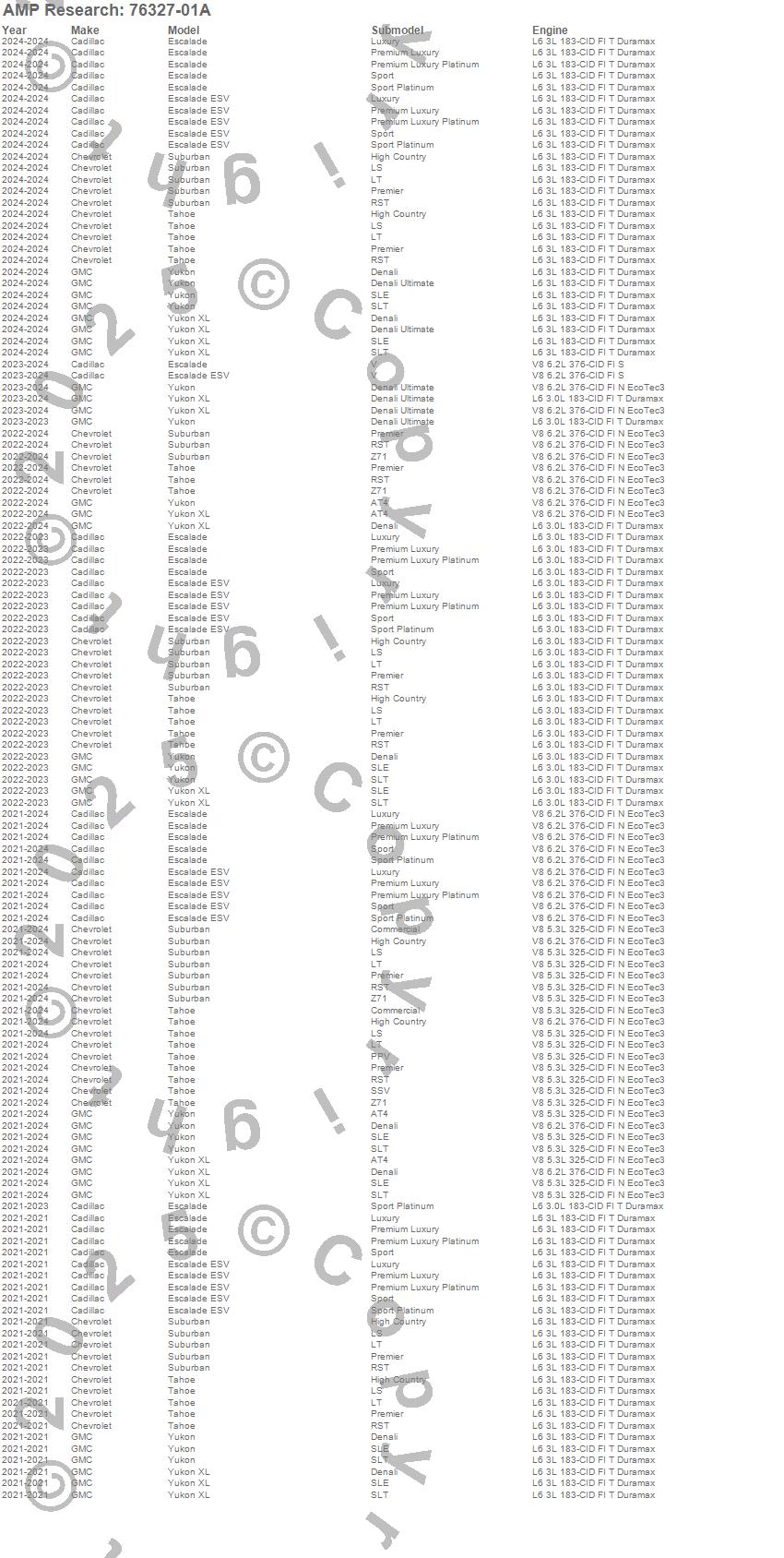 Below is an abbreviated list of applications for the PowerStep.Escalade, Escalade ESV, Suburban, Tahoe, Yukon, Yukon XL, Cadillac, Chevrolet, GMC, 2026, 2025, 2024, 2023, 2022, 2021