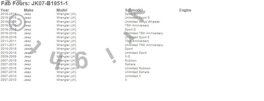 Brand: Fab FoursPart Number: JK07-B1951-1Bumper- Front Type: w/No Guard - 2 Stage Matte Black Powder CoatedUPC: 005810120429