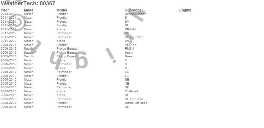 Below is an abbreviated list of applications for the Side Window Deflector.Equator, Frontier, Pathfinder, Xterra, Nissan, Suzuki, 2021, 2020, 2019, 2018, 2017, 2016, 2015, 2014, 2013, 2012, 2011, 2010, 2009, 2008