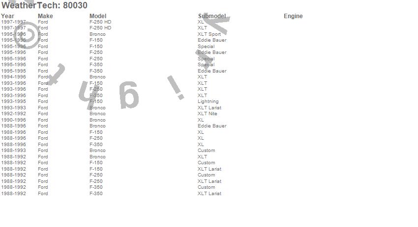 Below is an abbreviated list of applications for the Side Window Deflector.Bronco, F-150, F-250, F-250 HD, F-350, Ford, 1997, 1996, 1995, 1994, 1993, 1992, 1991, 1990, 1989, 1988
