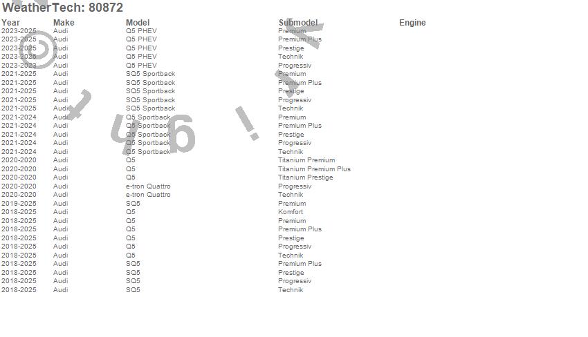 Below is an abbreviated list of applications for the Side Window Deflector.e-tron Quattro, Q5, Q5 PHEV, Q5 Sportback, SQ5, SQ5 Sportback, Audi, 2025, 2024, 2023, 2022, 2021, 2020, 2019, 2018
