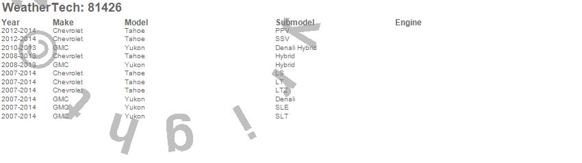 Below is an abbreviated list of applications for the Side Window Deflector.Tahoe, Yukon, Chevrolet, GMC, 2014, 2013, 2012, 2011, 2010, 2009, 2008, 2007