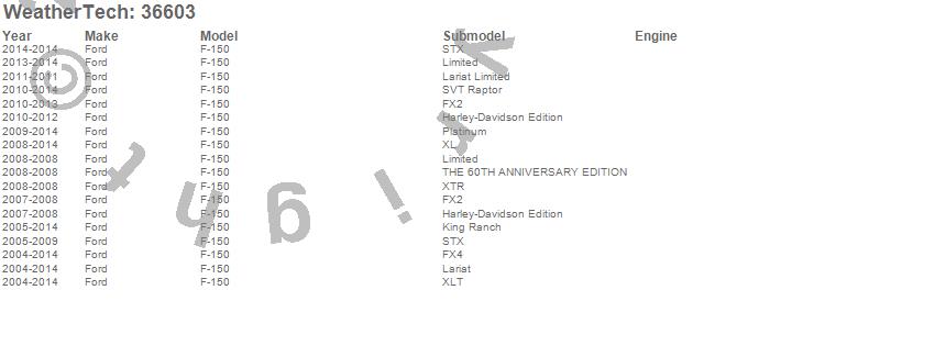 Below is an abbreviated list of applications for the WeatherTech TechLiner Bed Liner.F-150, Ford, 2014, 2013, 2012, 2011, 2010, 2009, 2008, 2007, 2006, 2005, 2004