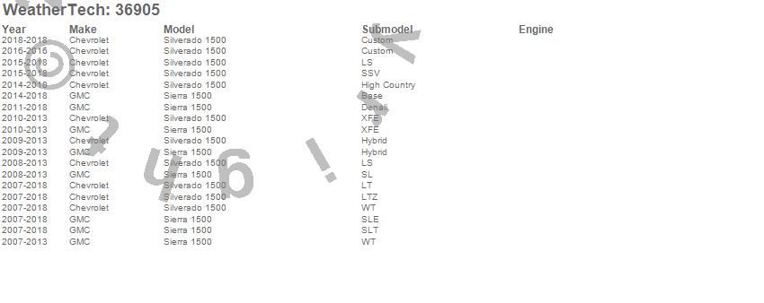 Below is an abbreviated list of applications for the WeatherTech TechLiner Bed Liner.Sierra 1500, Silverado 1500, Chevrolet, GMC, 2018, 2017, 2016, 2015, 2014, 2013, 2012, 2011, 2010, 2009, 2008, 2007