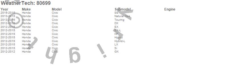 Below is an abbreviated list of applications for the Side Window Deflector.Civic, Honda, 2015, 2014, 2013, 2012