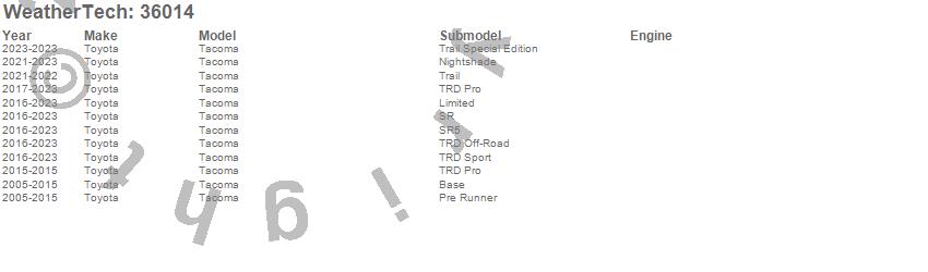 Below is an abbreviated list of applications for the WeatherTech TechLiner Bed Liner.Tacoma, Toyota, 2023, 2022, 2021, 2020, 2019, 2018, 2017, 2016, 2015, 2014, 2013, 2012, 2011, 2010, 2009, 2008, 2007, 2006