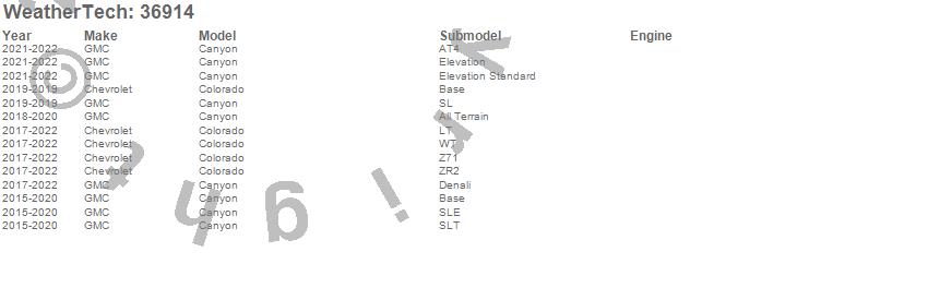 Below is an abbreviated list of applications for the WeatherTech TechLiner Bed Liner.Canyon, Colorado, Chevrolet, GMC, 2022, 2021, 2020, 2019, 2018, 2017, 2016, 2015
