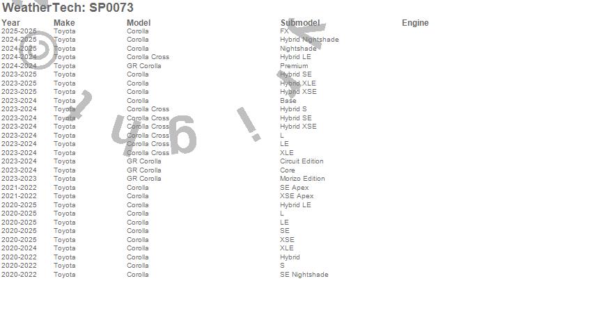 Below is an abbreviated list of applications for the Scratch Protection Film.Corolla, Corolla Cross, GR Corolla, Toyota, 2026, 2025, 2024, 2023, 2022, 2021, 2020