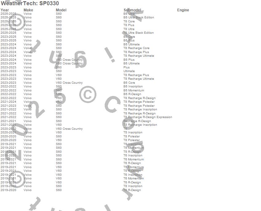Below is an abbreviated list of applications for the Scratch Protection Film.S60, V60, V60 Cross Country, Volvo, 2025, 2024, 2023, 2022, 2021, 2020, 2019