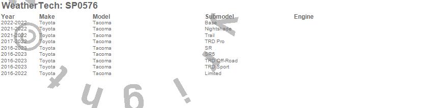 Brand: WeatherTechPart Number: SP0576Body Protection Film Type: TransparentUPC: 787765784931