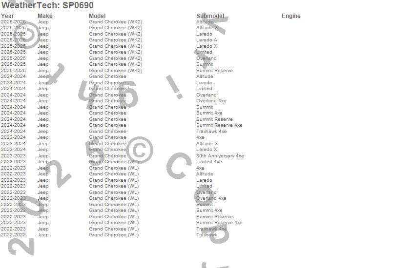 Below is an abbreviated list of applications for the Scratch Protection Film.Grand Cherokee, Grand Cherokee (WK2), Grand Cherokee (WL), Jeep, 2025, 2024, 2023, 2022
