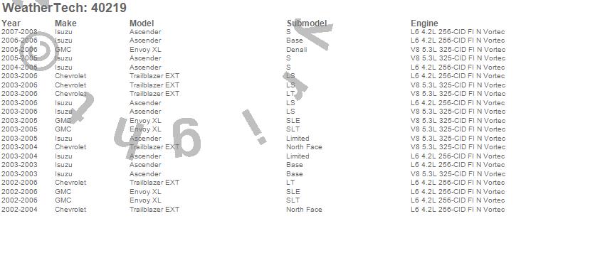 Below is an abbreviated list of applications for the Cargo Liner.Ascender, Envoy XL, Trailblazer EXT, Chevrolet, GMC, Isuzu, 2008, 2007, 2006, 2005, 2004, 2003, 2002