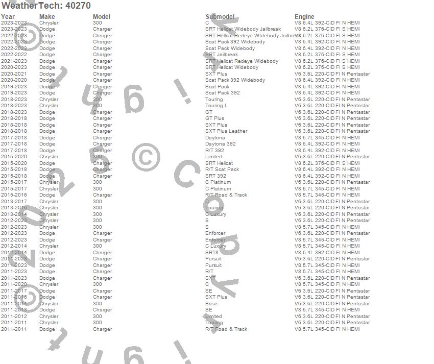 Below is an abbreviated list of applications for the Cargo Liner.300, Charger, Chrysler, Dodge, 2023, 2022, 2021, 2020, 2019, 2018, 2017, 2016, 2015, 2014, 2013, 2012, 2011