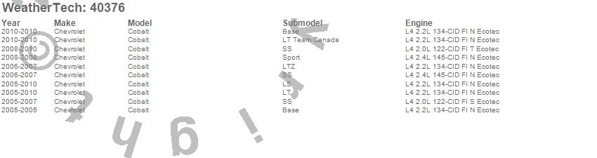 Below is an abbreviated list of applications for the Cargo Liner.Cobalt, Chevrolet, 2010, 2009, 2008, 2007, 2006, 2005