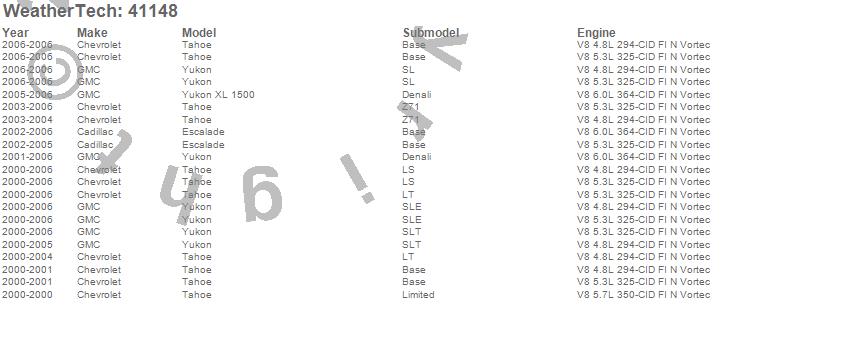 Below is an abbreviated list of applications for the Cargo Liner.Escalade, Tahoe, Yukon, Yukon XL 1500, Cadillac, Chevrolet, GMC, 2006, 2005, 2004, 2003, 2002, 2001, 2000