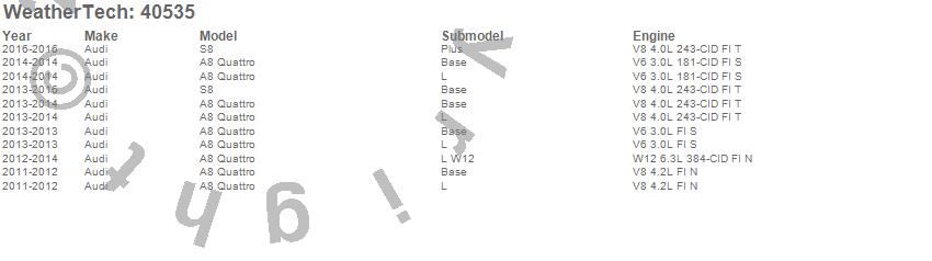 Below is an abbreviated list of applications for the Cargo Liner.A8 Quattro, S8, Audi, 2016, 2015, 2014, 2013, 2012, 2011
