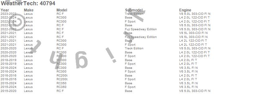 Below is an abbreviated list of applications for the Cargo Liner.RC F, RC200t, RC300, RC350, Lexus, 2024, 2023, 2022, 2021, 2020, 2019, 2018, 2017, 2016, 2015