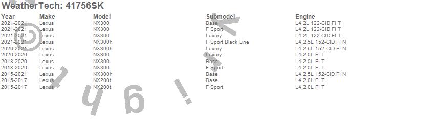 Below is an abbreviated list of applications for the Cargo Liner w/Bumper Protector.NX200t, NX300, NX300h, Lexus, 2021, 2020, 2019, 2018, 2017, 2016, 2015