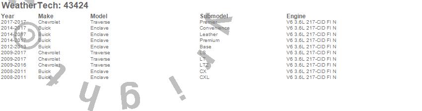 Below is an abbreviated list of applications for the Cargo Liner.Enclave, Traverse, Buick, Chevrolet, 2017, 2016, 2015, 2014, 2013, 2012, 2011, 2010, 2009, 2008