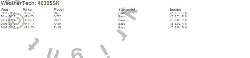 Below is an abbreviated list of applications for the Cargo Liner w/Bumper Protector.FX35, FX50, QX70, INFINITI, 2017, 2016, 2015, 2014, 2013, 2012, 2011, 2010, 2009