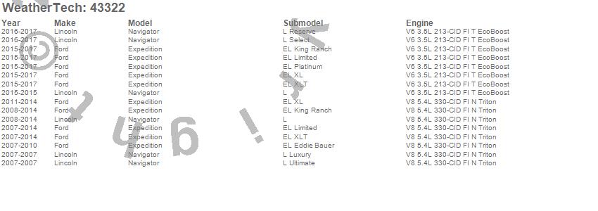 Below is an abbreviated list of applications for the Cargo Liner.Expedition, Navigator, Ford, Lincoln, 2017, 2016, 2015, 2014, 2013, 2012, 2011, 2010, 2009, 2008, 2007