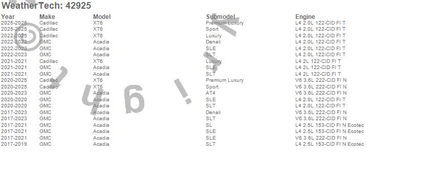 Below is an abbreviated list of applications for the Cargo Liner.Acadia, XT6, Cadillac, GMC, 2025, 2024, 2023, 2022, 2021, 2020, 2019, 2018, 2017