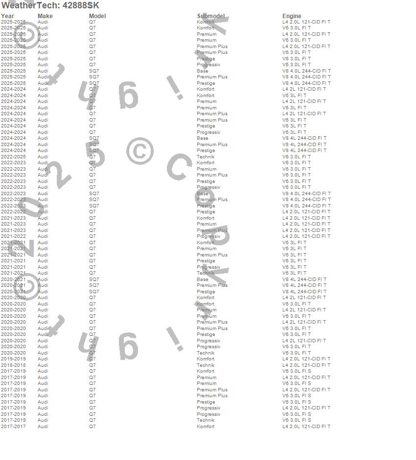 Below is an abbreviated list of applications for the Cargo Liner w/Bumper Protector.Q7, SQ7, Audi, 2026, 2025, 2024, 2023, 2022, 2021, 2020, 2019, 2018, 2017