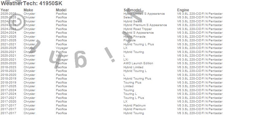 Below is an abbreviated list of applications for the Cargo Liner w/Bumper Protector.Pacifica, Voyager, Chrysler, 2026, 2025, 2024, 2023, 2022, 2021, 2020, 2019, 2018, 2017