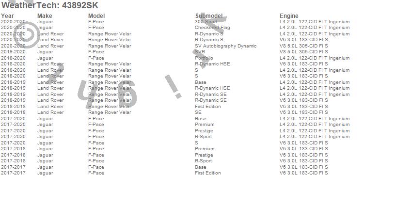 Below is an abbreviated list of applications for the Cargo Liner w/Bumper Protector.F-Pace, Range Rover Velar, Jaguar, Land Rover, 2020, 2019, 2018, 2017