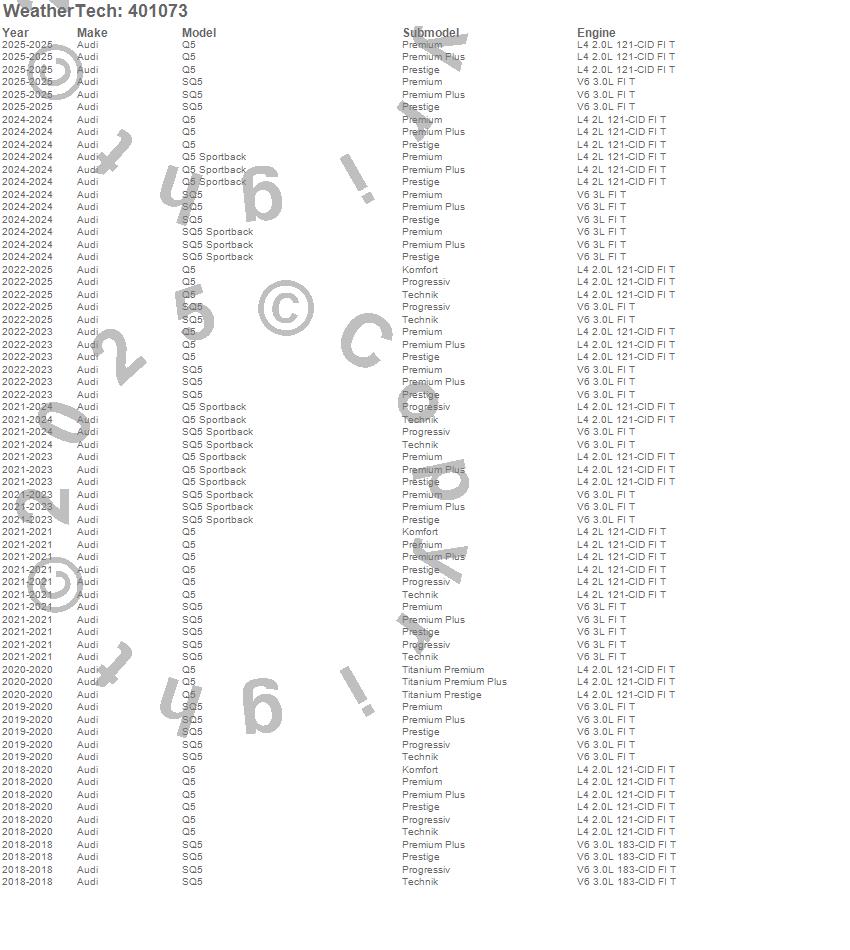 Below is an abbreviated list of applications for the Cargo Liner.Q5, Q5 Sportback, SQ5, SQ5 Sportback, Audi, 2025, 2024, 2023, 2022, 2021, 2020, 2019, 2018