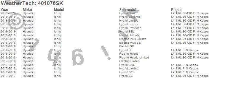 Below is an abbreviated list of applications for the Cargo Liner w/Bumper Protector.Ioniq, Hyundai, 2022, 2021, 2020, 2019, 2018, 2017