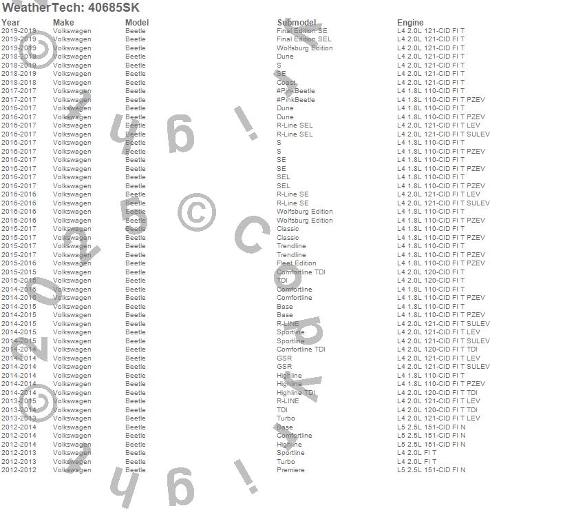 Below is an abbreviated list of applications for the Cargo Liner w/Bumper Protector.Beetle, Volkswagen, 2019, 2018, 2017, 2016, 2015, 2014, 2013, 2012