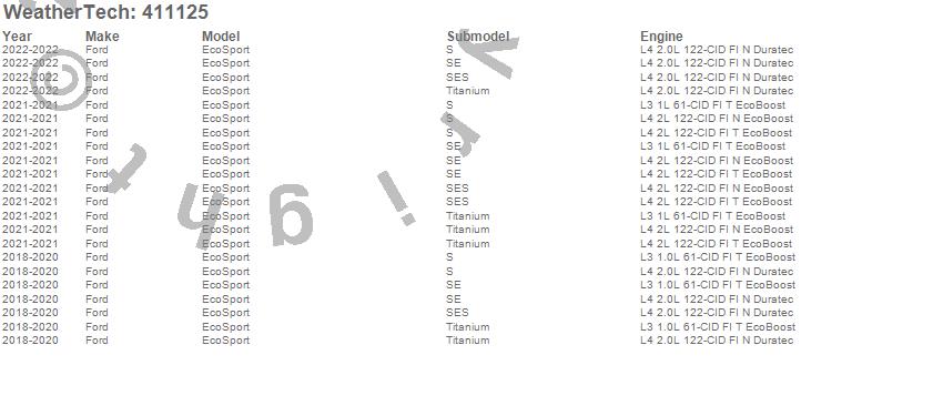 Below is an abbreviated list of applications for the Cargo Liner.EcoSport, Ford, 2022, 2021, 2020, 2019, 2018
