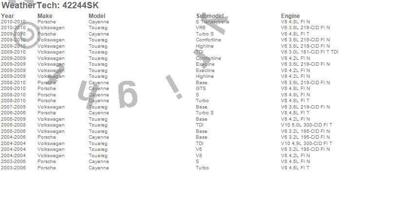 Below is an abbreviated list of applications for the Cargo Liner w/Bumper Protector.Cayenne, Touareg, Porsche, Volkswagen, 2010, 2009, 2008, 2007, 2006, 2005, 2004, 2003