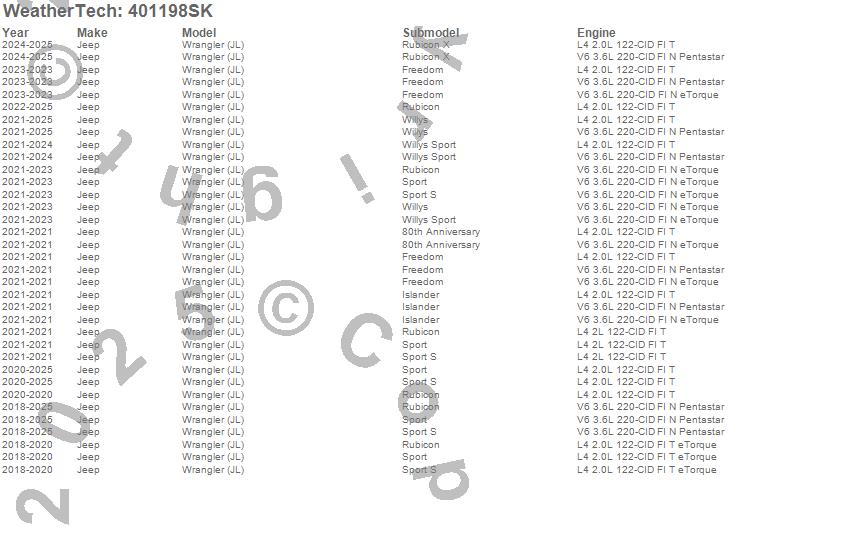 Below is an abbreviated list of applications for the Cargo Liner w/Bumper Protector.Wrangler, Wrangler (JL), Jeep, 2026, 2025, 2024, 2023, 2022, 2021, 2020, 2019, 2018