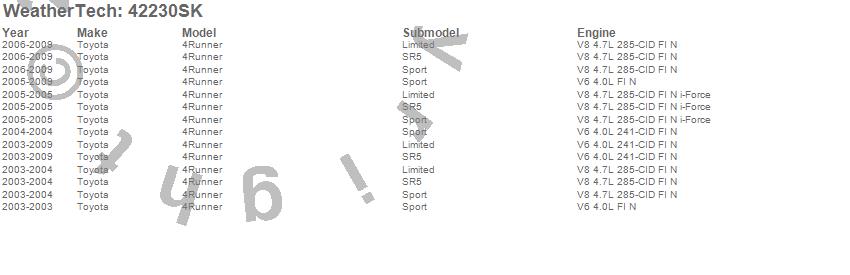 Below is an abbreviated list of applications for the Cargo Liner w/Bumper Protector.4Runner, Toyota, 2009, 2008, 2007, 2006, 2005, 2004, 2003