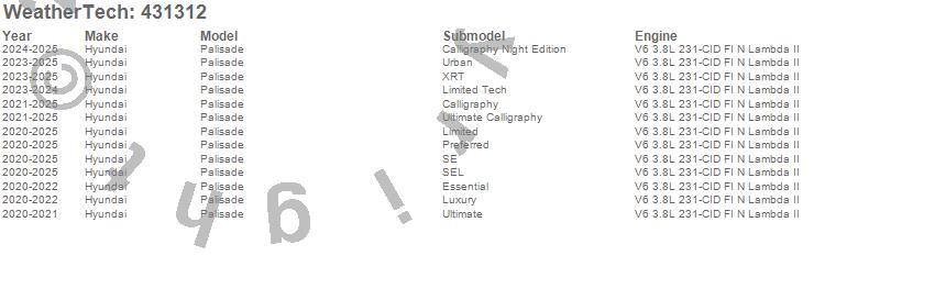 Below is an abbreviated list of applications for the Cargo Liner.Palisade, Hyundai, 2025, 2024, 2023, 2022, 2021, 2020