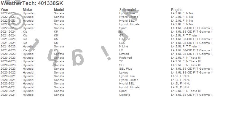 Below is an abbreviated list of applications for the Cargo Liner w/Bumper Protector.K5, Sonata, Hyundai, Kia, 2024, 2023, 2022, 2021, 2020