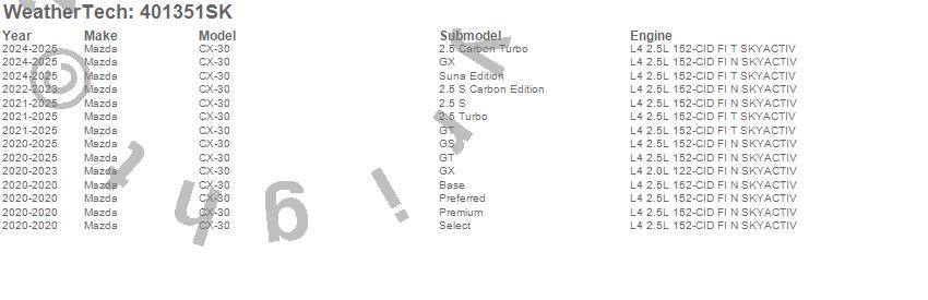 Below is an abbreviated list of applications for the Cargo Liner w/Bumper Protector.CX-30, Mazda, 2025, 2024, 2023, 2022, 2021, 2020