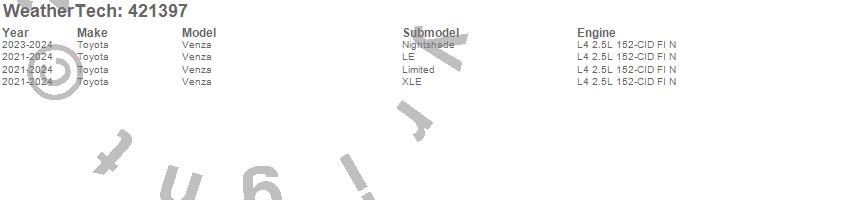 Below is an abbreviated list of applications for the Cargo Liner.Venza, Toyota, 2024, 2023, 2022, 2021