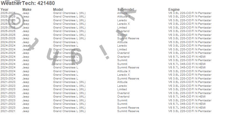 Below is an abbreviated list of applications for the Cargo Liner.Grand Cherokee L, Grand Cherokee L (WL), Jeep, 2025, 2024, 2023, 2022, 2021