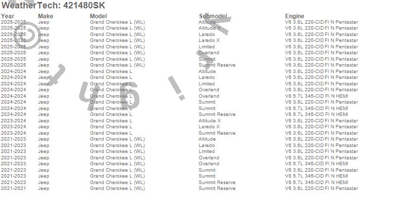 Below is an abbreviated list of applications for the Cargo Liner w/Bumper Protector.Grand Cherokee L, Grand Cherokee L (WL), Jeep, 2025, 2024, 2023, 2022, 2021