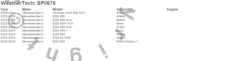 Below is an abbreviated list of applications for the Scratch Protection Film.EQS 450, EQS 450 SUV, EQS 450+, EQS 450+ SUV, EQS 53 AMG, EQS 580, EQS 580 SUV, Maybach EQS 680 SUV, Mercedes-Benz, 2025, 2024, 2023, 2022