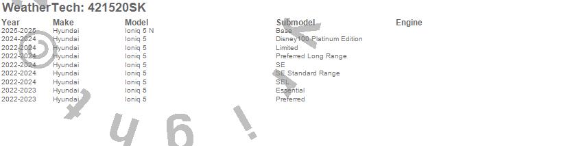 Below is an abbreviated list of applications for the Cargo Liner w/Bumper Protector.Ioniq 5, Ioniq 5 N, Hyundai, 2025, 2024, 2023, 2022