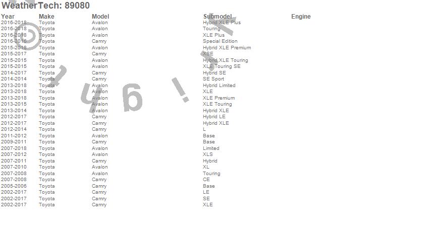 Below is an abbreviated list of applications for the Sunroof Wind Deflector.Avalon, Camry, Toyota, 2018, 2017, 2016, 2015, 2014, 2013, 2012, 2011, 2010, 2009, 2008, 2007, 2006, 2005, 2004, 2003, 2002