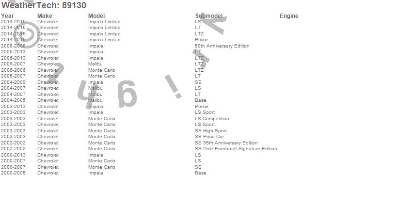 Below is an abbreviated list of applications for the Sunroof Wind Deflector.Impala, Impala Limited, Malibu, Monte Carlo, Chevrolet, 2015, 2014, 2013, 2012, 2011, 2010, 2009, 2008, 2007, 2006, 2005, 2004, 2003, 2002, 2001
