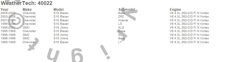 Below is an abbreviated list of applications for the Cargo Liner.S10 Blazer, S15 Jimmy, Chevrolet, GMC, 2005, 2004, 2003, 2002, 2001, 2000, 1999, 1998, 1997, 1996, 1995