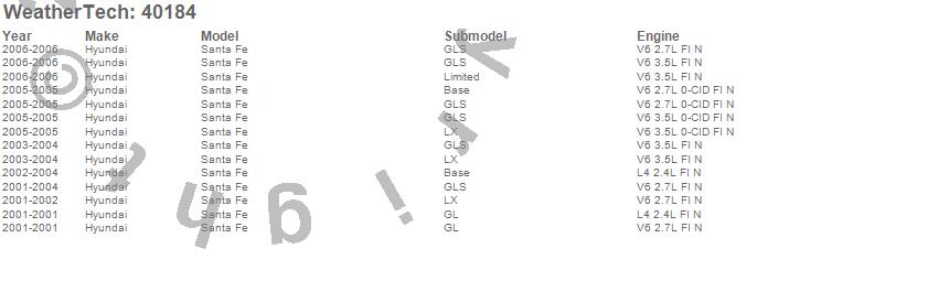 Below is an abbreviated list of applications for the Cargo Liner.Santa Fe, Hyundai, 2006, 2005, 2004, 2003, 2002, 2001