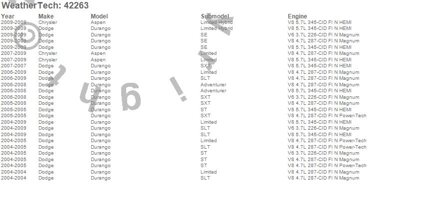 Below is an abbreviated list of applications for the Cargo Liner.Aspen, Durango, Chrysler, Dodge, 2009, 2008, 2007, 2006, 2005, 2004