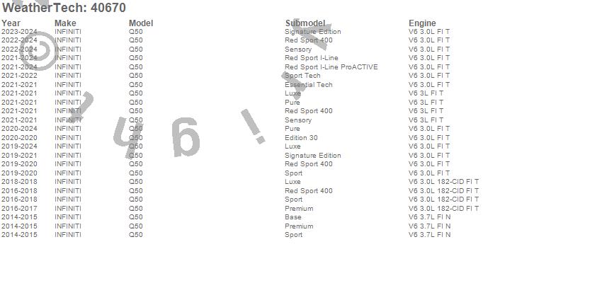 Below is an abbreviated list of applications for the Cargo Liner.Q50, INFINITI, 2024, 2023, 2022, 2021, 2020, 2019, 2018, 2017, 2016, 2015, 2014